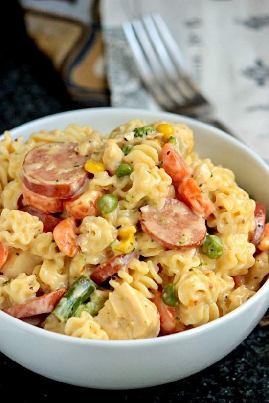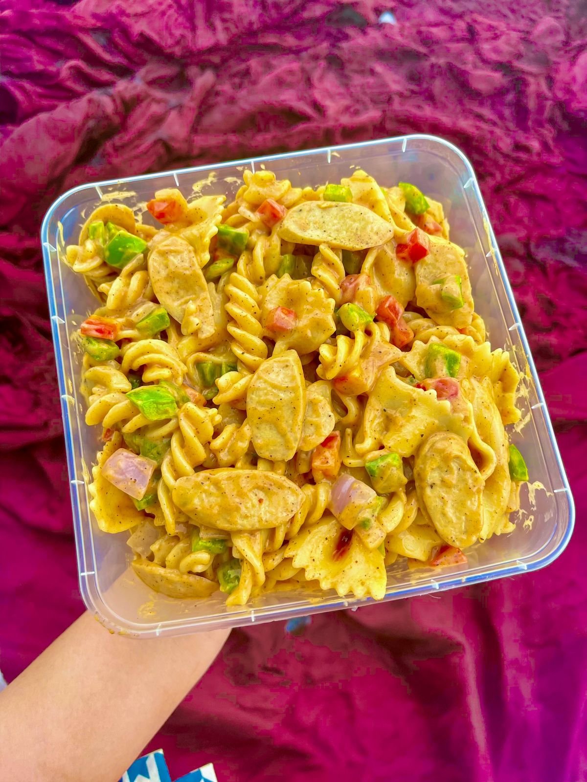 Garden fresh vegetables with macaroni and chicken sausages tossed in mayo and house special dressing.